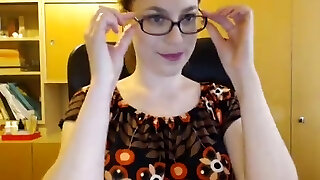 Big-titted nerdy brunette gets cum on her glasses after giving a blowjob