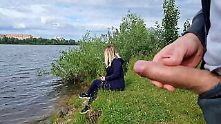 The exhibitionist man saw a lonely gal in nature and took out his boner in front of her and began to masturbate the knob in front unacquainted cutie, he risks scaring her, but she likes to look at a ginormous male dick and wants to see his cumshot